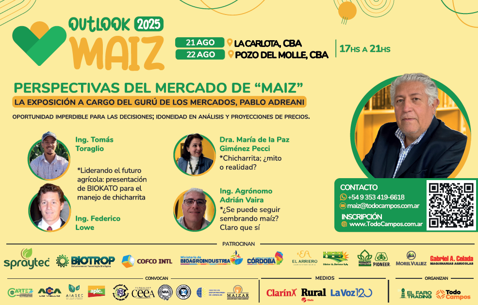 El miércoles 21 de agosto, la convocatoria será en el salón del club Jorge Ross de La Carlota, desde las 17 hasta las 21. El ministro de Bioagroindustria de Córdoba, Sergio Busso, será quien dará apertura al evento en su primera jornada. Pablo Adreani, “gurú de los mercados”, abordará las perspectivas del mercado del maíz.